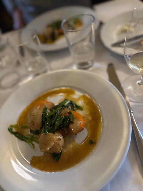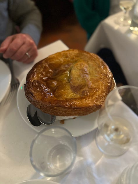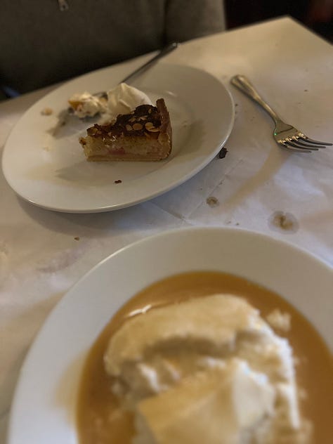 Initially offering an à la carte menu, the restaurant now offers a single set menu. The price, 50 pounds sans alcohol, covers enough food to negate the need for much more than a light dinner of half a toastie and a couple bites of salad for a late dinner (which is, yes, what my husband and I noshed on after a long stroll complete with pub stops back to our hotel).